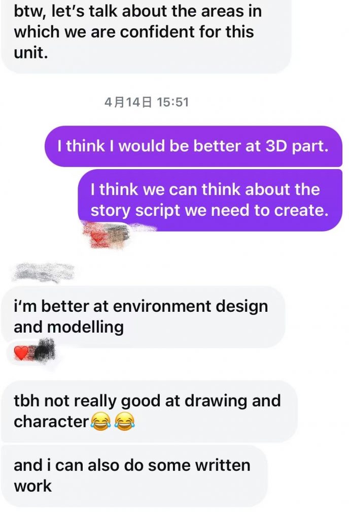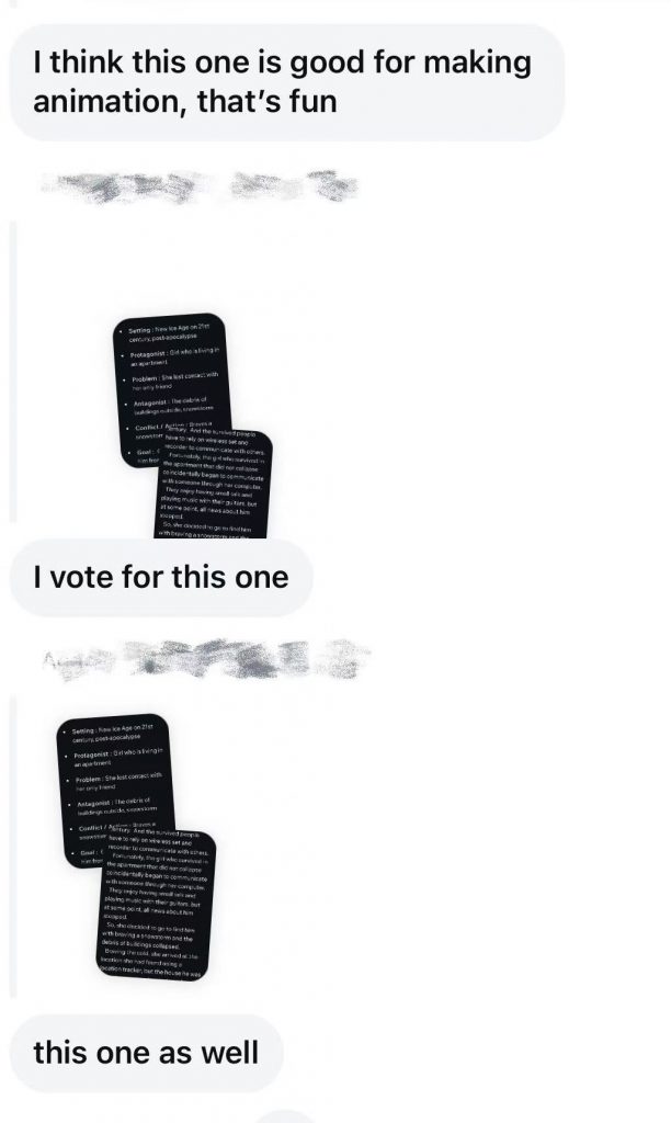 In this unit’s group collaboration project, we first carried out preliminary creative preparation: each team member independently wrote a short play story outline, and then through an internal group vote, we selected the outline with the most consensus as the core story framework for the entire group project. This process not only integrated the diverse creativity of team members, but also clarified the main creative direction for follow-up work through democratic decision-making, laying the foundation for the script polishing, scene design, and division of labor execution of the short play.