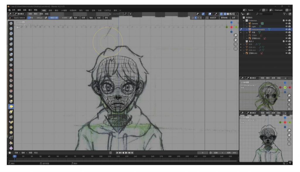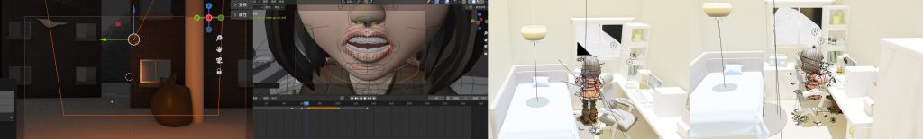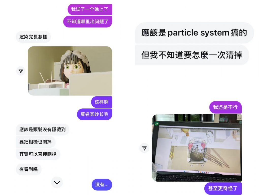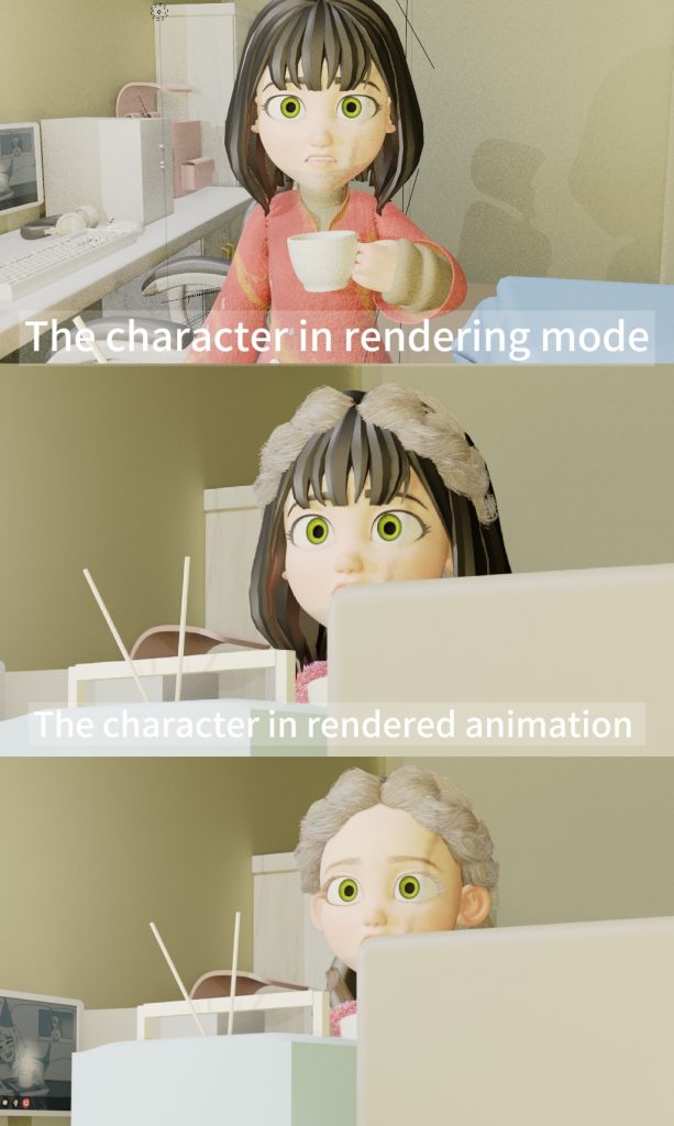 After finishing these texture mappings, my group members and I all breathed a sigh of relief. But unexpectedly, something unexpected happened again. In our modeling, the character appeared differently in rendering mode and the final animated video. A strange phenomenon occurred in the protagonist’s hair after rendering—abnormal strands grew, which confused my team and me. We started troubleshooting the issue.