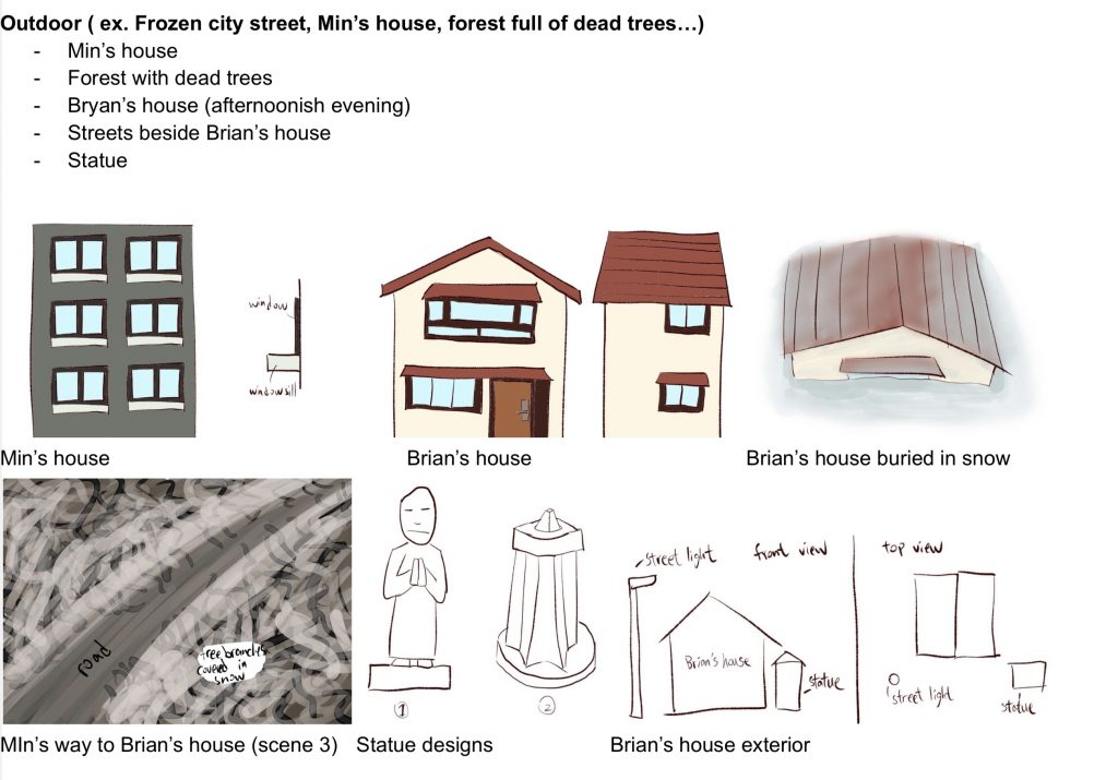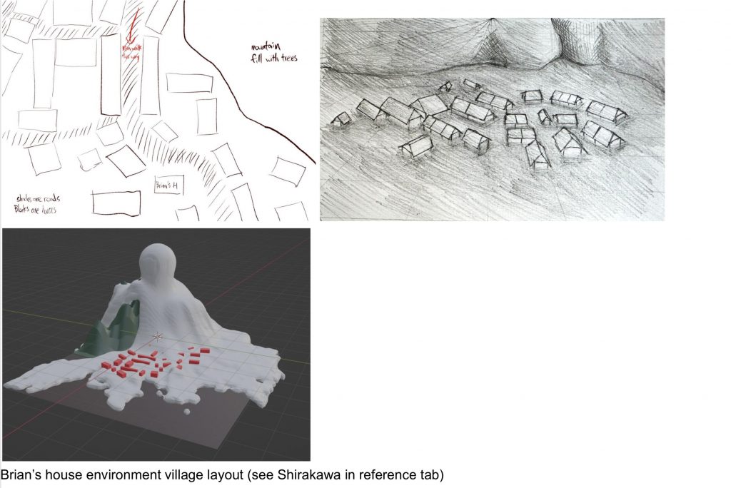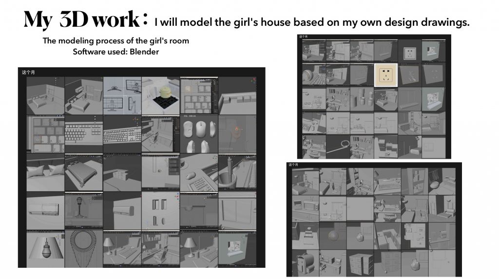 Then I began to collect reference pictures and make some rough partial designs. My team members completed preliminary design sketches for the room exterior and the layout of the two houses, providing a basis for my ongoing design work.
