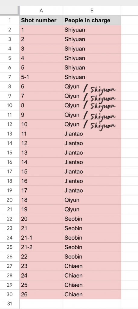 I was assigned shots 1 to 5, but to ease my teammates’ workload, I volunteered to take on extra parts. I have completed shots 1 to 10.