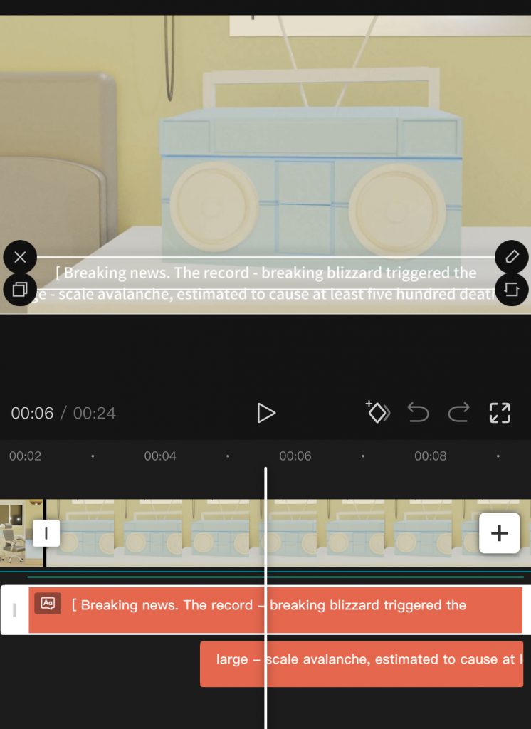 After adding these sound effects, I started to insert subtitles. For example, there is a scene where a radio broadcasts subtitles, so I need to add the broadcasted subtitles into our video.