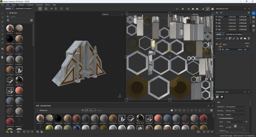 After that, I tried using Substance Painter (PT) to create materials for the modeled door. At first, I found that the textures were not natural enough and somewhat disordered. Later, I went back to Blender, unwrapped every detail of my model and adjusted the face orientations, after which I was able to get good textures in Substance Painter (PT).