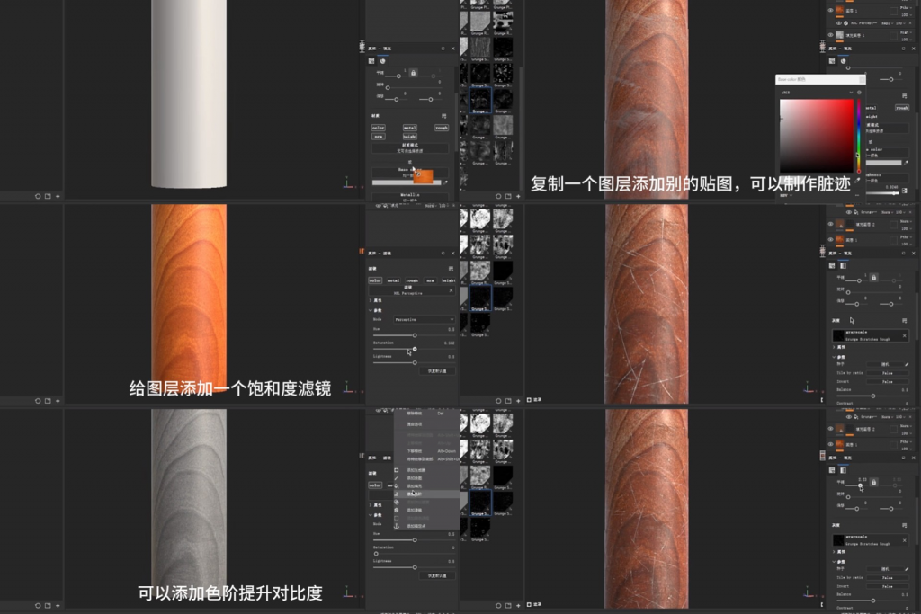 At first, I found a follow-along tutorial online to learn how to apply materials in this software, as well as how to adjust the saturation and contrast of colors, and so on. Eventually, I learned how to apply textures to 3D models, such as adding wood scratches and giving the scratches a sense of depth.